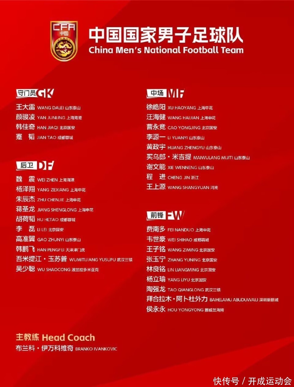 除了侯永永首次入选外,还包括吴少聪、杨立瑜等球员。